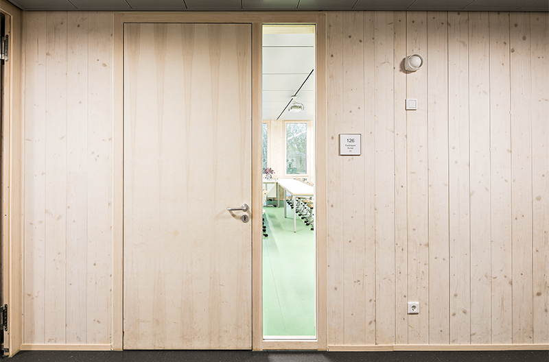 “没有什么比临时方案更持久的了。”这句俗语同样适用于 Gymnasium Nord学校的新校舍。因为只要在新址的新校舍实际完工后,这栋建筑就会被改造。因此,即使是一所临时学校,无论是从总体设计,还是所选产品的质量上来看,建筑师们都非常重视高品质。基于此,整个校舍使用了约200扇施库博高品质木制门。其中主要是防火门和隔音门。它们采用实木门框,门扇尺寸相当大。无论从设计还是功能性上,在某些情况下,门上还会配置透光口。部分门,例如通往教室的门,