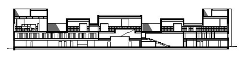 Here, cars exit the downstairs level via the ramp parallel to the facade, which